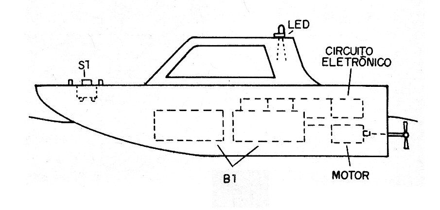 Todo lo que se debe hacer es perforar la parte superior del plástico y colocar la chavita que encender y apagar el circuito (S1). Otro agujero, en posición que debe ser elegido según el barco es para el LED. El soporte de pilas, motor y circuito electrónico quedará en la parte interna del bar. Los barcos de juguete ya tendrán el motor fijado para accionar una hélice.