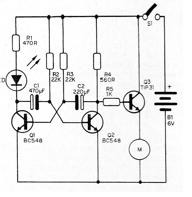 El multivibrador controla un motor de 6 V a través de un transistor de potencia. El motor puede ser obtenido de algún juguete de pilas fuera de uso.