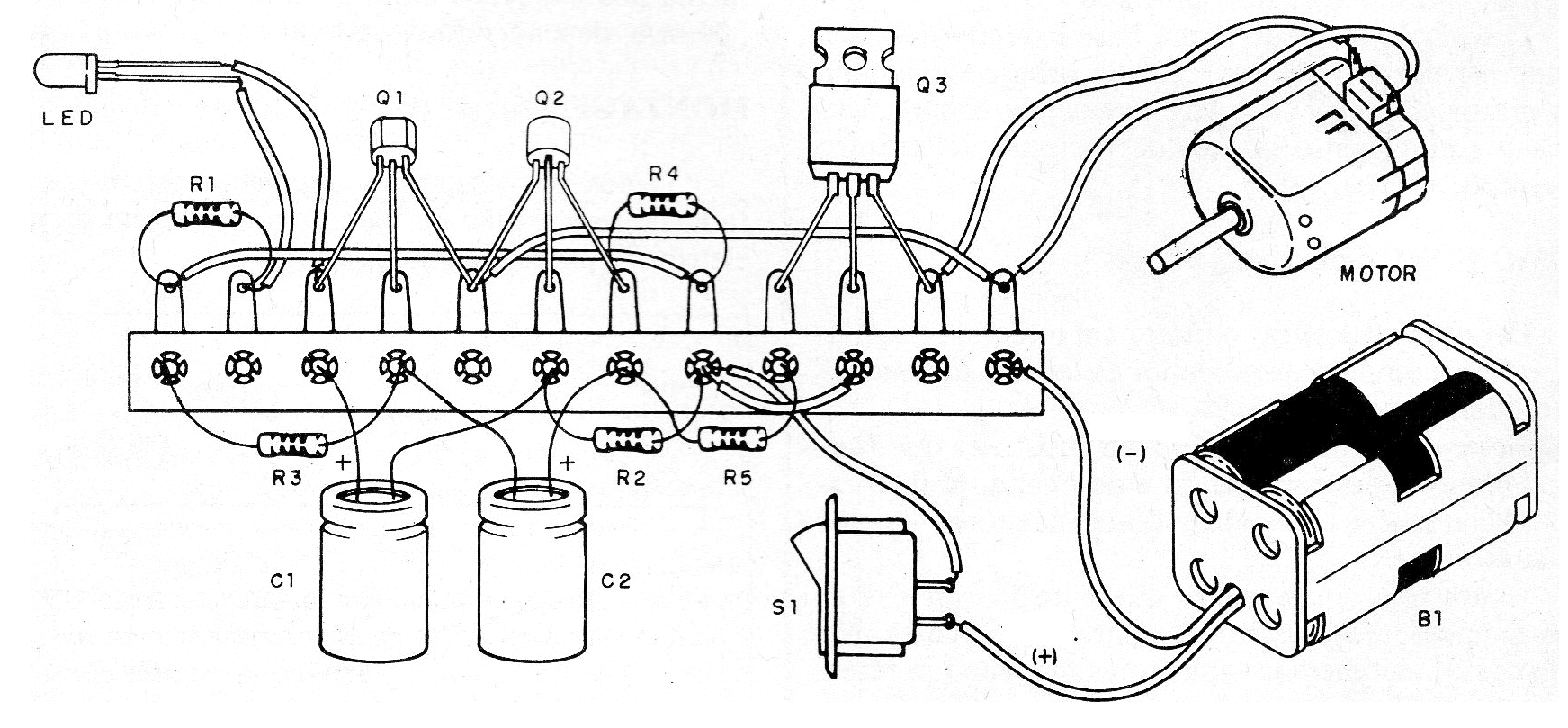 Observe cuidadosamente las posiciones de los componentes. Si al accionar el motor girar "al contrario", invierta sus hilos de conexión. Los capacitores electrolíticos se pueden cambiar para modificar los tiempos de accionamiento.