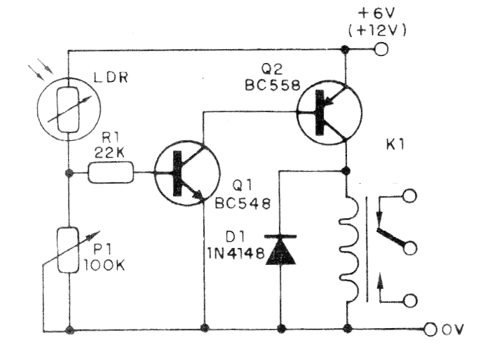 El circuito presentado dispara un relé cuando incide en el sensor, un LDR redondo común. Podemos utilizar este circuito como un control remoto con linterna o como ojos de un robot para seguir la luz.
