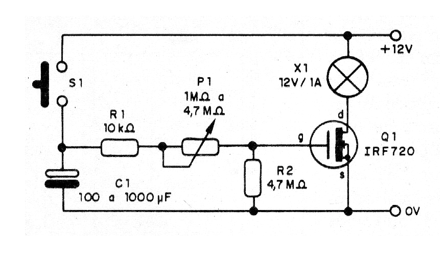 Este simple temporizador puede mantener encendida una lámpara de 12 V por intervalos entre algunos segundos hasta algunos minutos, dependiendo del valor del capacitor usado y del ajuste de P1. Las lámparas con corrientes de hasta 1 A se pueden utilizar, dependiendo del MOSFET usado.