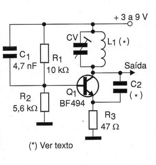 El transistor puede ser el BF494 o equivalentes y todos los condensadores deben ser cerámicos de buena calidad. Para el ajuste fino de frecuencias el trimmer puede tener valores entre 5 y 20 pF de capacitancia máxima.