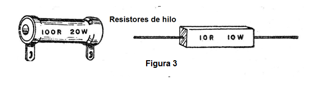 b) resistores de hilo en los que el elemento responsable de la resistencia es un hilo metálico normalmente de níquel con cromo (nicromo) y que son mucho más grandes ya que se utilizan en los casos en que las corrientes que pasan por los mismos son más intensas generando mayor cantidad de calor. La figura 3 muestra los aspectos de estos resistores.