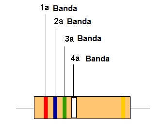 En esta figura el lector ve que un resistor puede tener 3 o 4 anillos coloridos cuyo orden es dado desde el extremo hacia el medio. Para los resistores de 4- anillos sólo los tres primeros indican su resistencia, siendo el cuarto usado para otra especificación que veremos a continuación.