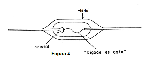 Estos son pequeños diodos generalmente con envoltorios de vidrio en los que el elemento semiconductor es un pequeño cristal de germanio o silicio sobre el que se apoya un hilo muy fino de contacto llamado "bigote de gato". La figura 4 muestra un diodo de este tipo.