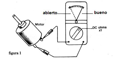 Utilizando el multímetro en la escala más baja de resistencia (x1), apoyamos las puntas de prueba en los terminales del motor (en el circuito o fuera de él). La resistencia medida debe ser muy baja, de no más de unas decenas de ohms (fig.1).
