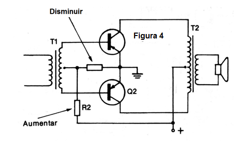 En los radios que tienen etapas de este tipo, un pequeño "arreglo puede" ayudar a reducir el consumo. Este arreglo consiste en la alteración de los resistores indicados en la figura 4, que deben tener sus valores modificados hasta el punto en que se obtiene el menor consumo sin distorsión de la señal de salida.