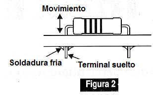 b) Realice una inspección visual, procurando ver si no hay cables sueltos o con malos contactos, o aún pistas en la placa de circuito impreso interrumpidas. Ver si no hay soldaduras frías responsables de terminales de componentes sueltos, como muestra la figura 2.