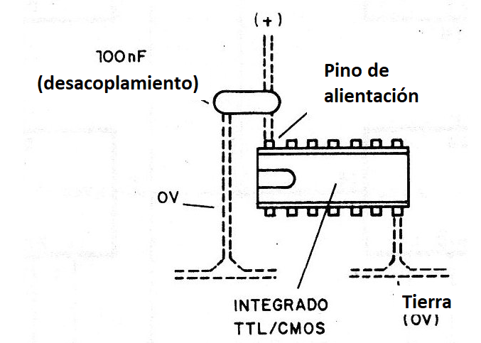 Para la mayoría de los integrados TTL esta alimentación se realiza en el pin 14 o 16, así como en la mayoría de los CMOS, pero existen excepciones, lo que significa que el reparador debe estar en posesión, o del diagrama del aparato o de un manual de circuitos digitales correspondientes a la tecnología empleada.