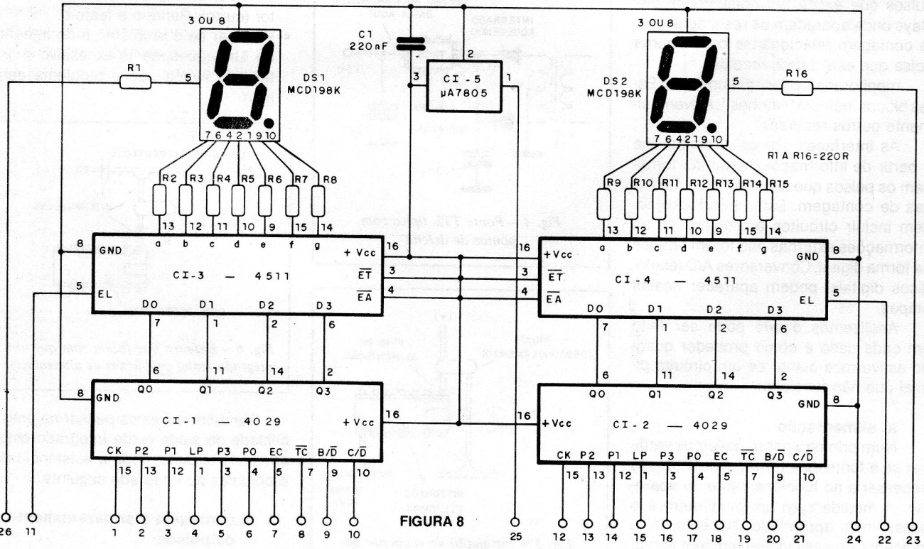 En la figura 7 tenemos una etapa típica TTL de recuento y almacenamiento de impulsos y, en el 8, un paso equivalente con integrados CMOS.