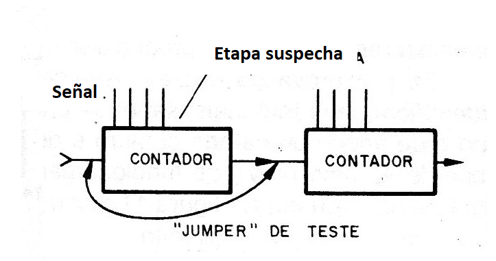 Algunos artificios pueden ayudar en la localización de problemas en las etapas contadoras Uno de ellos consiste en "jumpear" la señal de una etapa sospechosa con la aplicación en el paso siguiente, como muestra la figura 15.