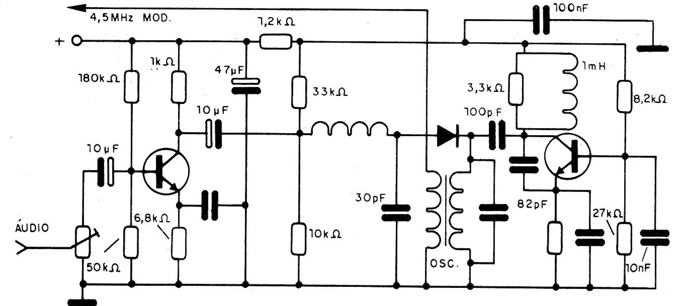 Este circuito tiene un oscilador de 4,5 MHz que es modulado por la señal de audio.