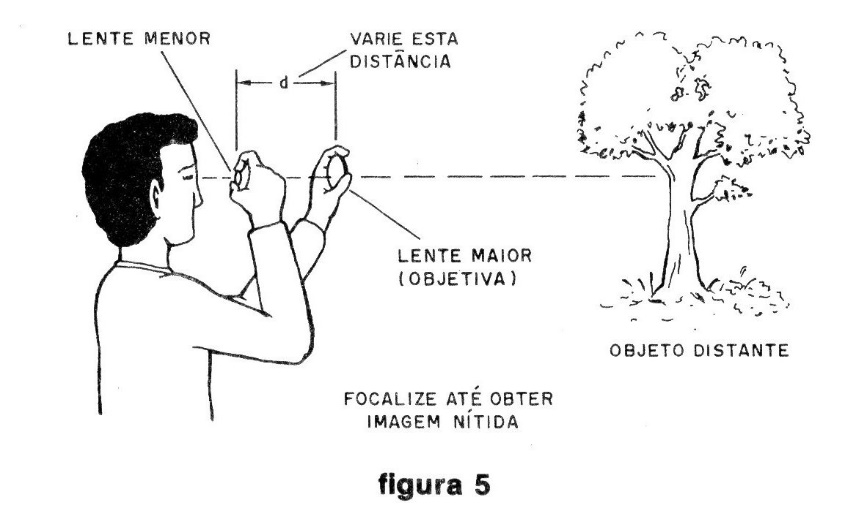 Para hacer su visor, debe determinar la distancia relativa de las dos lentes, como se muestra en la figura 5. Coloque las dos lentes frente a sus ojos e intente enfocar un objeto distante hasta que parezca agrandado y nítido. Esta debe ser la distancia determinada experimentalmente.