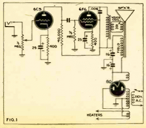 Este pequeño amplificador de 3 válvulas es de una publicación de 1943. Tenga en cuenta el uso de un altavoz de campo con la bobina generando el campo magnético conectado en serie con la fuente de alimentación. Una configuración típica de la época.