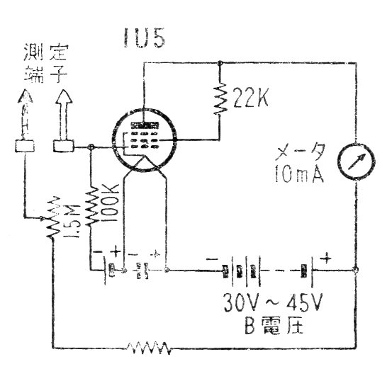 Utilizando una válvula poco común, este circuito posibilita el empleo de un miliamperímetro de 10 mA de fondo de escala para medir corrientes de hasta 10 uA. El circuito es de una publicación japonesa de 1969 siendo alimentado por dos baterías, una pila y una batería de alta tensión.