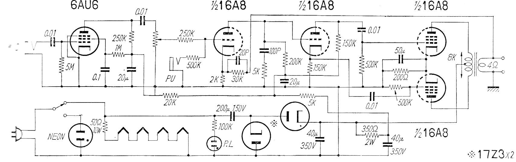 Este amplificador de algunos vatios de potencia no utiliza transformador de fuerza. Su alimentación es directa con los filamentos de las válvulas conectadas en serie. Esta configuración requiere cuidados en el uso, pues la entrada no está aislada, pudiendo causar choques. El circuito es de una documentación japonesa de los años 60.