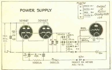 El propósito de este circuito es suministrar tensiones que normalmente se usan en radios portátiles antiguos que usan baterías. El circuito es de una publicación de 1943 haciendo uso de válvulas de la época que seguramente serían reemplazadas por diodos de silicio en una adaptación moderna.