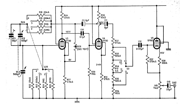 Este circuito es de una documentación de 1968. La alimentación se hace con tensiones de 200 a 300 V y las válvulas pueden ser equivalentes. La precisión de las señales depende de las resistencias usadas.