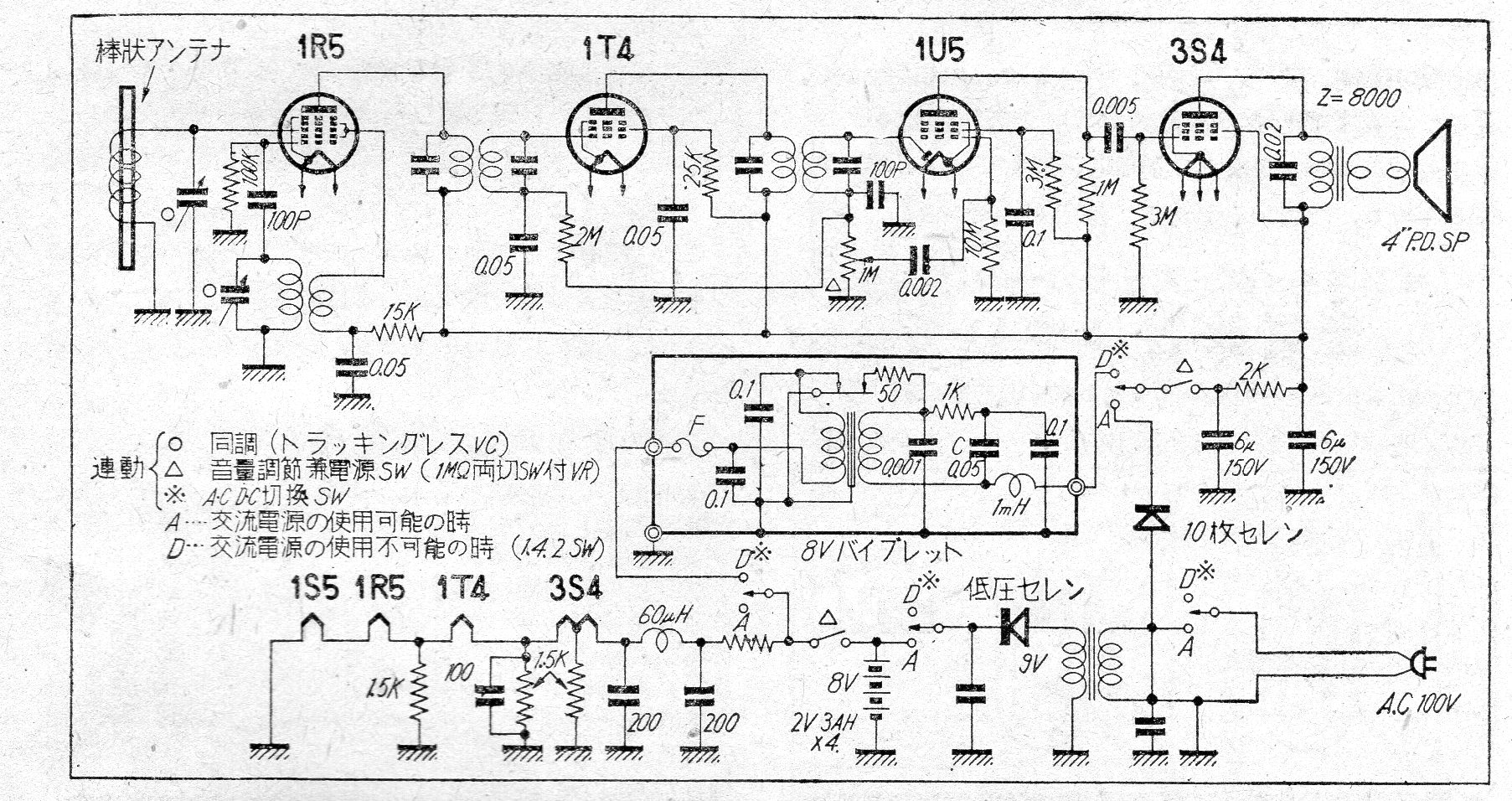 Este receptor de los años 50 utiliza válvulas de la época y recibe la banda de ondas medias con una bobina de ferrita usada en la función de antena. La bobina puede tener de 80 a 100 espiras de cable 32 y la alimentación se realiza a partir de la red de energía.