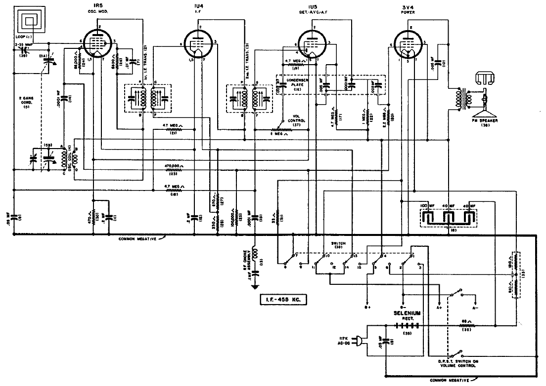 Este receptor de 4 válvulas recibía las estaciones de onda medias y tenía por diferencial el uso de un diodo de selenio en la fuente, en lugar de la válvula rectificadora.