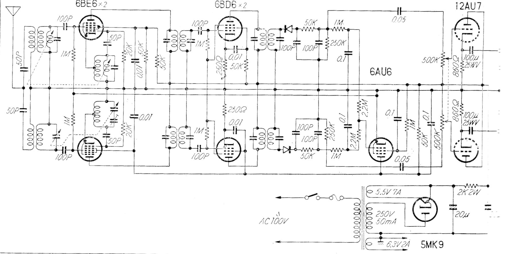 Este es un circuito de un sintonizador AM de la década de 60. El circuito se encontró en una documentación japonesa de la época y no tiene decodificador estéreo, que todavía no se utilizó. En aquella época lo que se hacía era transmitir los canales por dos frecuencias diferentes que se sintonizaban en circuitos diferentes. El circuito incluye la fuente de alimentación.