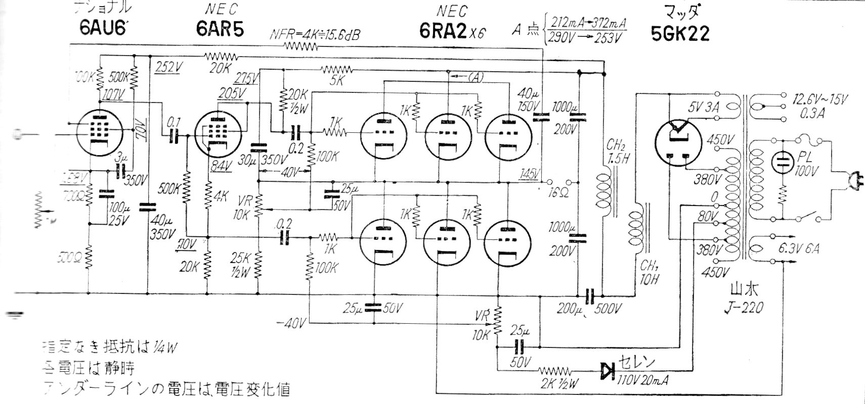 Este amplificador tiene una salida de 16 ohms que se ha encontrado en una documentación de los años 60. El diferencial es la no necesidad de transformador de salida dada la configuración de la etapa de potencia. Se incluye la fuente de alimentación.