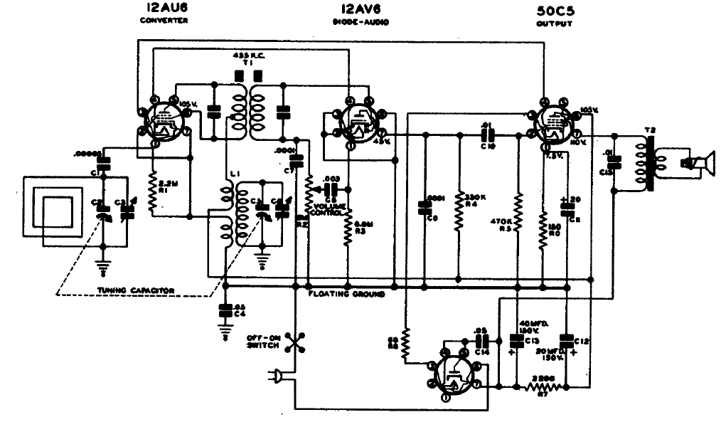 Encontramos este circuito simple de receptor de 4 válvulas en un manual de la época. Observe que el circuito tiene pocos pasos de amplificación y utiliza la antena de cuadro. La válvula rectificadora es una 35W4.
