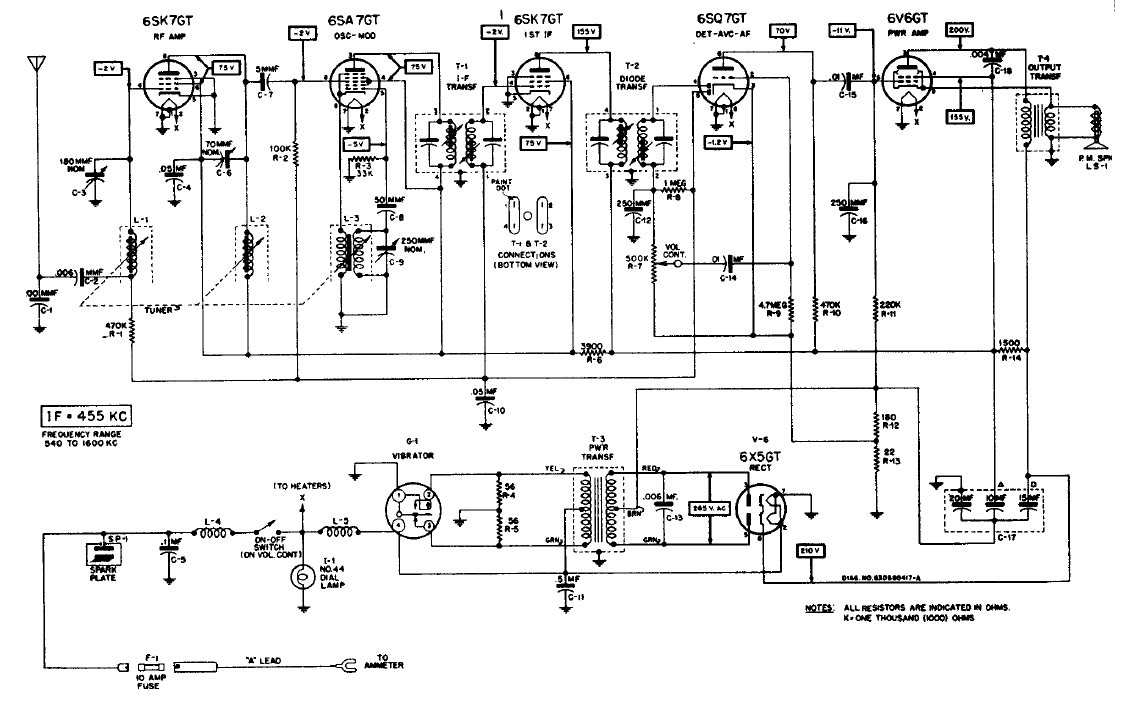 Esta radio valvulado para la banda de AM usaba vibrador para obtener la alta tensión. El circuito es para el rango de ondas medias con FI de 455 kHz.