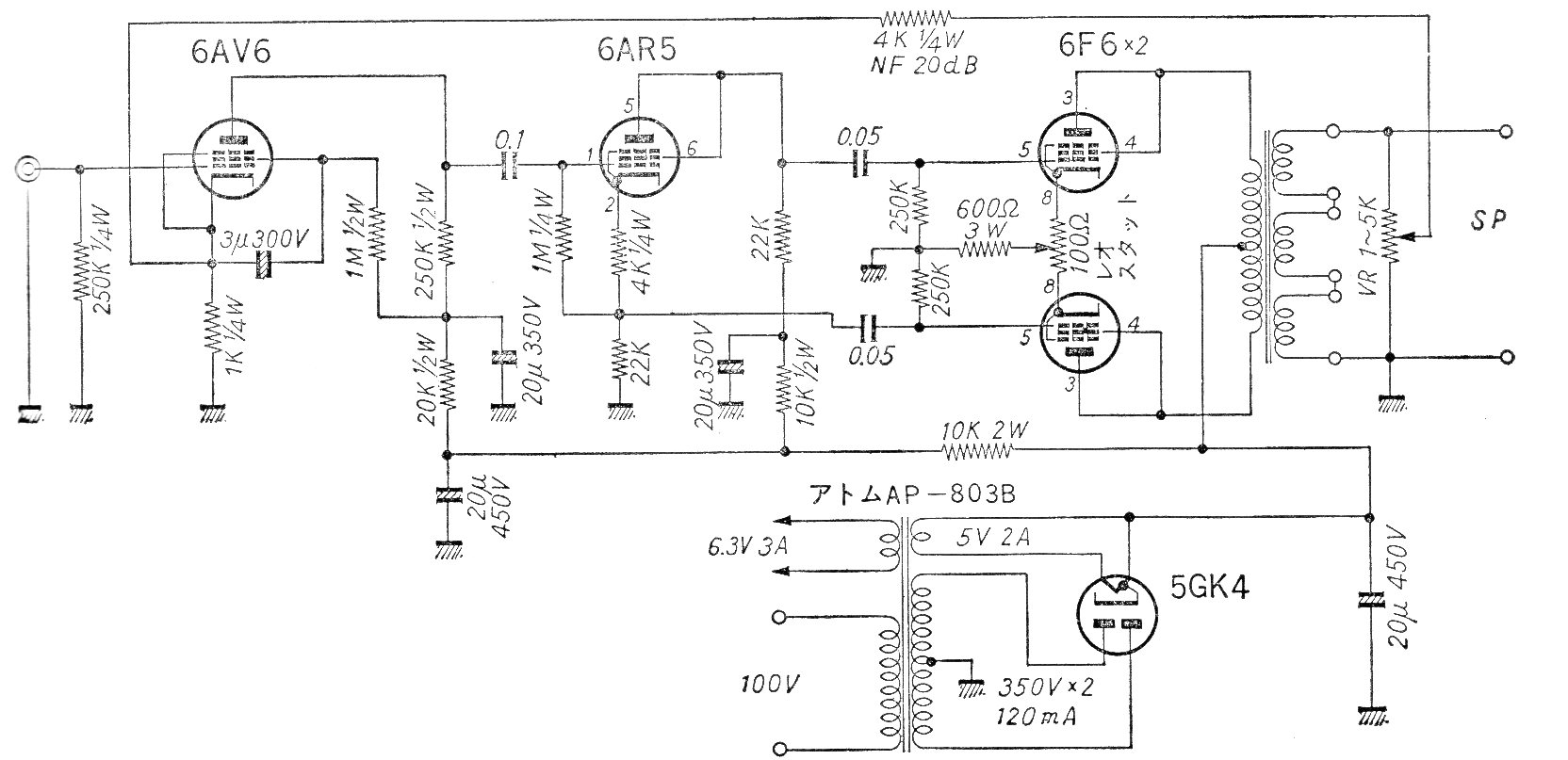 Encontramos este amplificador de 5 válvulas en una antigua documentación japonesa de los años 60. El circuito utiliza dos 6F6 en push-pull excitadas por una 6AR5 proporcionando algunos watts de audio de buena calidad. El circuito incluye la fuente de alimentación.
