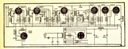 Este receptor sensible se encontró en la documentación de 1945. El circuito tiene una fuente con un transformador y está diseñado para el rango de onda media. La sensibilidad es grande debido a la cantidad de pasos de amplificación.