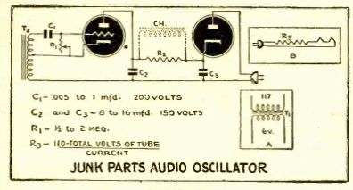 Encontrado en una publicación de 1943, ya usaba piezas de desecho en ese momento. El circuito está alimentado por la red eléctrica y la frecuencia depende de los componentes utilizados.