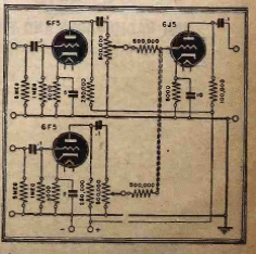 Este circuito de 3 válvulas tiene dos entradas. El circuito tiene las tensiones de alimentación indicados y dos entradas que eventualmente se pueden expandir.