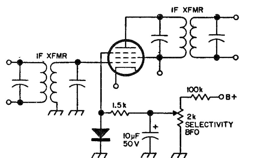 Este circuito muestra cómo realizar una adaptación en un receptor de AM para recibir señales CW y SSB. El circuito proviene de la documentación de un 80. El diodo se usa comúnmente.