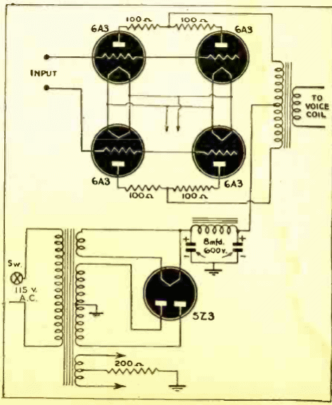 Esta etapa de potencia con válvulas triodo conectadas en paralelo se obtuvo en un documento de 1944. El circuito es típico de la época, ya que las válvulas pentodo aún no eran tan populares en este tipo de circuitos.