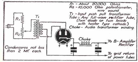En la figura tenemos un circuito de polarización improvisado con un transformador común. El circuito tiene un ajuste de tensión variable realizado por el potenciómetro, recordando que este componente y el resistor son tipos de potencia. El circuito es de una documentación de 1942. El tubo puede ser cualquier tipo de onda completa y debe tener un transformador para alimentar su filamento.