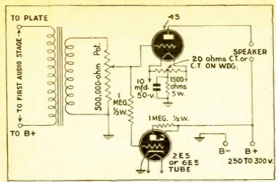Este es un paso de potencia que encontramos en una publicación de 1942. Es solo un paso de salida que sirve como refuerzo, por ejemplo, para radios más pequeñas u otras fuentes de señal. El circuito necesita alimentación con la tensión indicada.