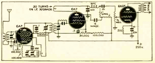Encontrado en una publicación de 1943, este receptor sintoniza bandas que dependen de la bobina de la antena y la bobina del oscilador. El circuito no incluye la fuente de alimentación y tiene suficiente salida para alimentar un altavoz pequeño.