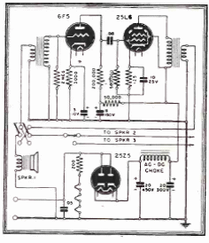 Este circuito fue tomado de una documentación de 1944. Utiliza 3 válvulas y una fuente de alimentación sin transformador. La longitud máxima de los cables entre estaciones está limitada por las pérdidas.