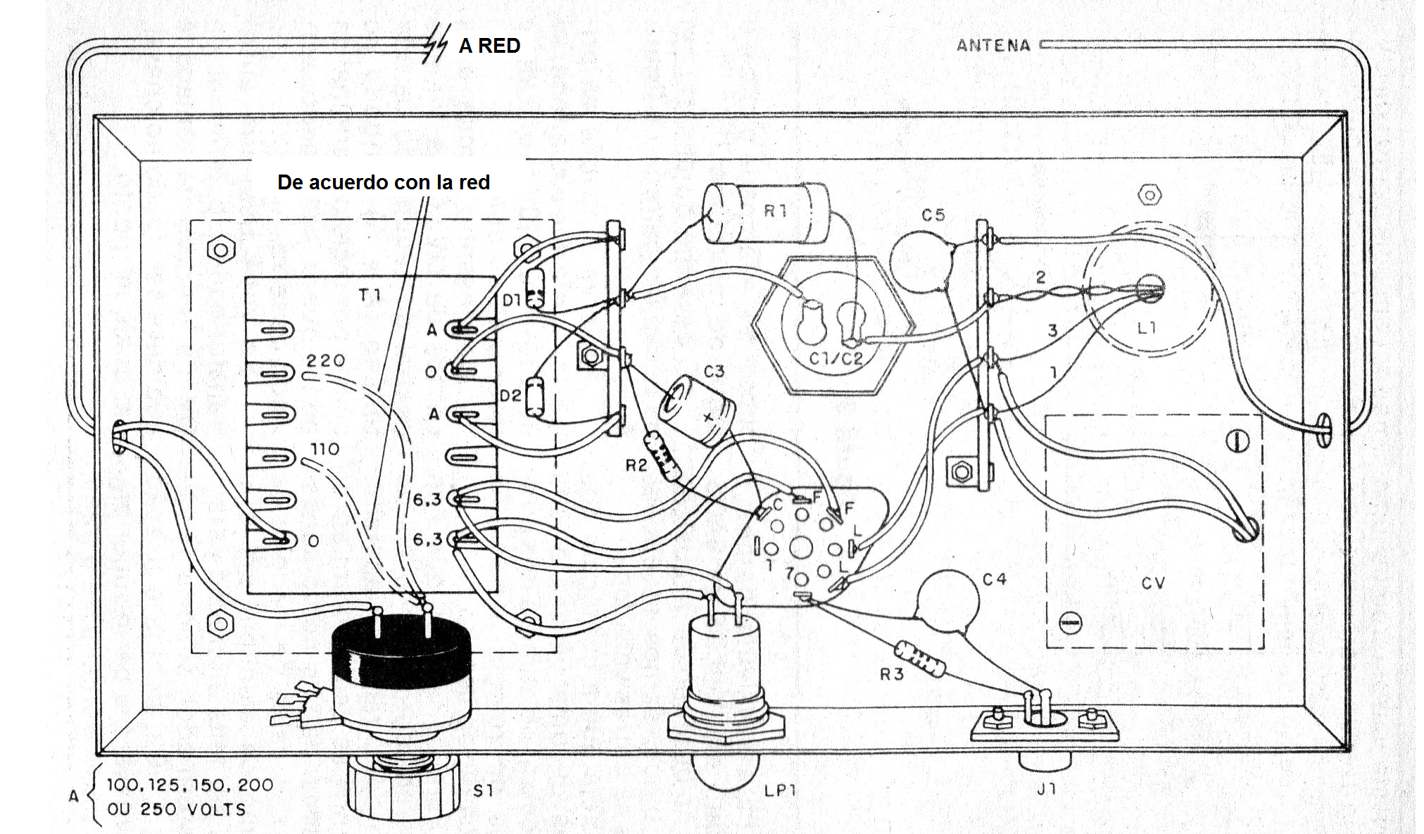 Para los lectores que no quieran aprovechar el chasis de la radio o del aparato del que se utilizan las piezas, sugerimos una caja de madera o incluso aluminio en la que se debe realizar la perforación del transformador, el soporte válvulas. C1/C2, la bobina y la fijación de la variable (en la parte superior), y en la parte delantera para el interruptor S1, la lámpara piloto y el Jack de micrófono J1.