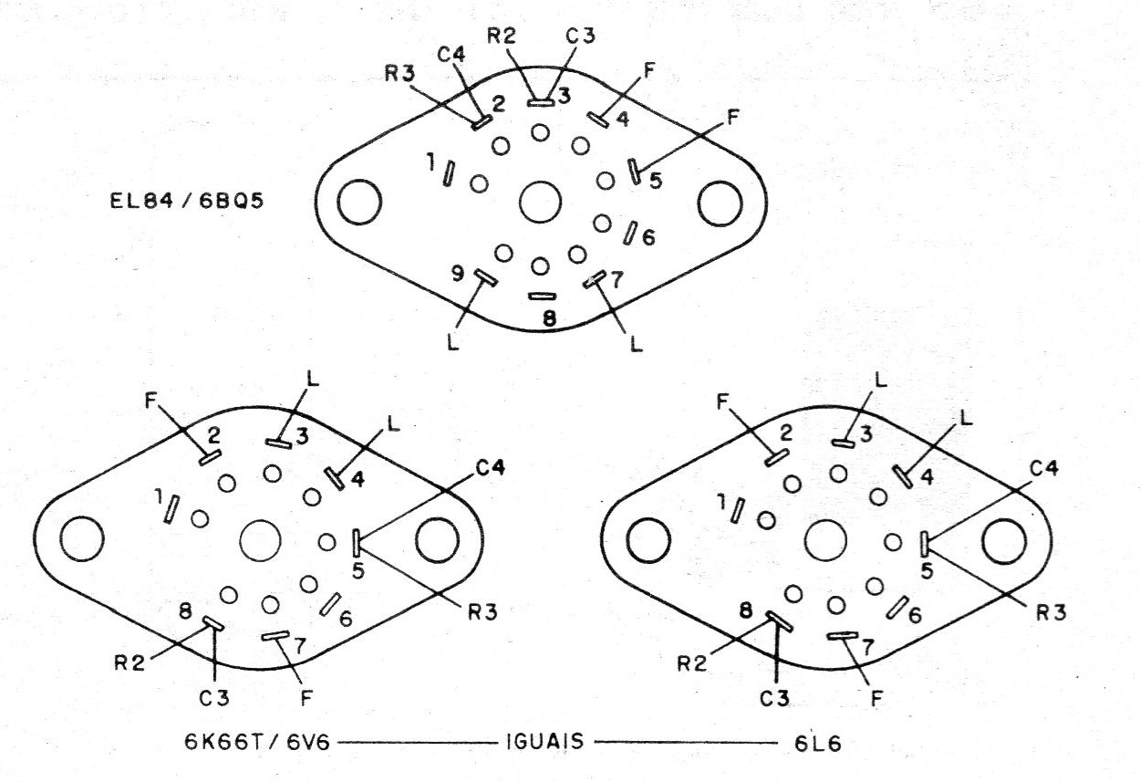 Para la válvula damos el circuito en función del 6AQ5, pero en el diseño de la disposición de los pines, damos las opciones para las otras válvulas.