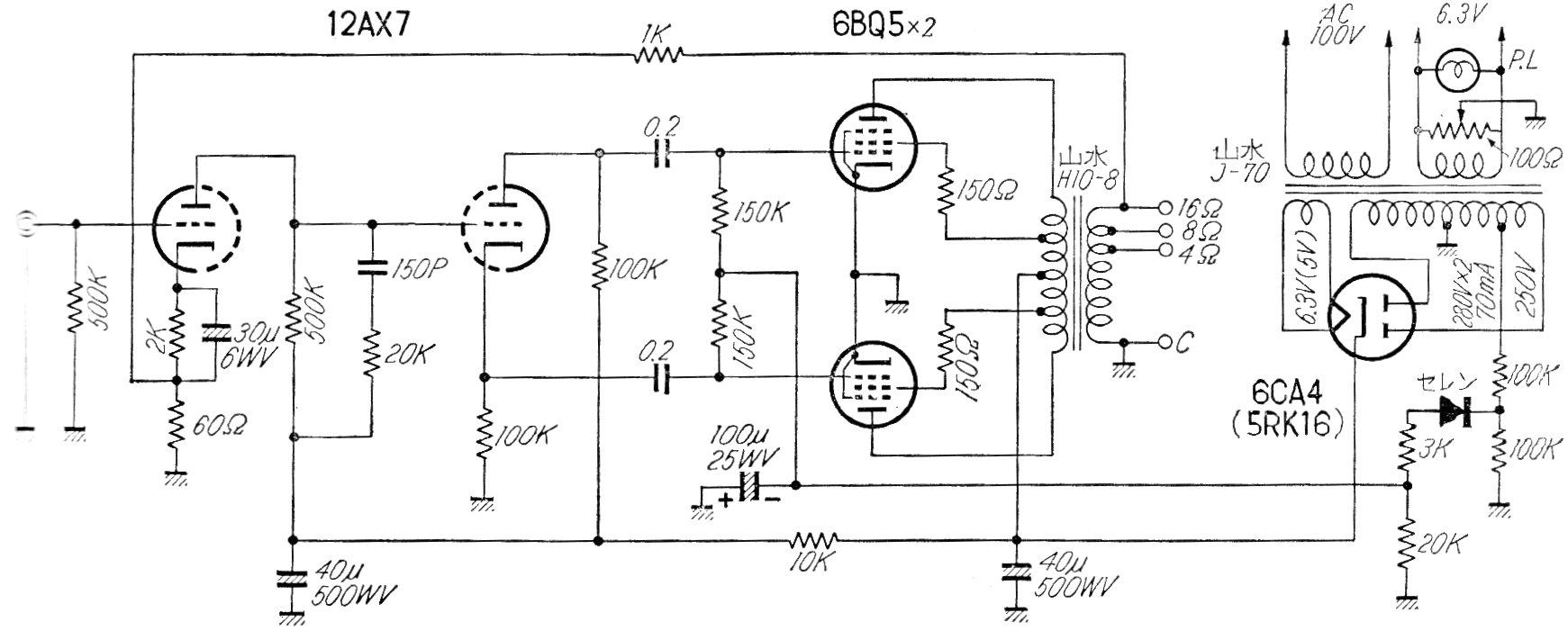 El circuito de amplificador con la válvula 6BQ5 presentado fue obtenido en una publicación japonesa de los años 60. El circuito tiene dos transformadores, uno para la salida y otro para la alimentación, proporcionando algunos vatios de potencia. El control de volumen y tono no se ha incluido en el preamplificador.