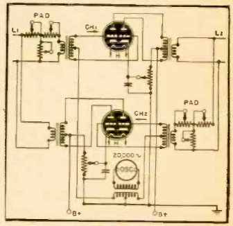 Indicado para intercomunicadores con cable, este circuito consta de dos amplificadores invertidos. Cada uno de ellos utiliza una válvula doble y los acoplamientos se realizan a través de transformadores.