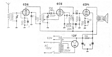 Este receptor de ondas medias con 4 válvulas fue obtenido en una documentación japonesa de los años 60. Las válvulas son de tipos poco comunes y los componentes críticos son también los transformadores. No se dan detalles de bobina de las bobinas.