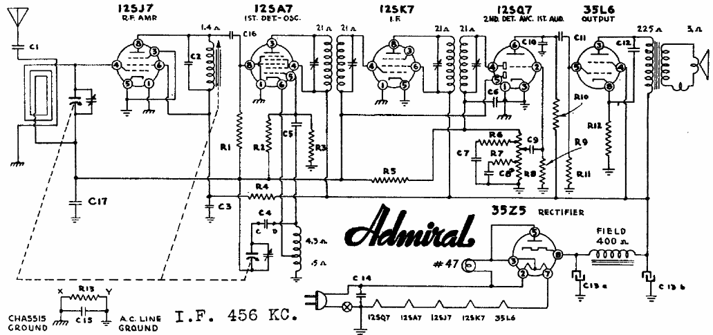 Esta radio AC / DC de 6 válvulas tenía una excelente sensibilidad tanto con la antena de cuadro como externa. El circuito es para el rango de ondas medias con FI 456 kHz.
