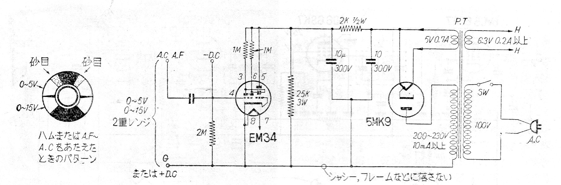 Este y un circuito utilizando la válvula indicadora del tipo ojo mágico. La EM34 es una válvula tipo "ojo mágico" que sirve como indicadora visual de sintonía o intensidad de señal, usada en equipos de los años 50, como este receptor. Esta válvula "encendía" con colocación azulada presentando una franja en forma de abanico que abría o cerraba conforme la intensidad de la señal. En la figura un indicador de señales de audio usando esta válvula.