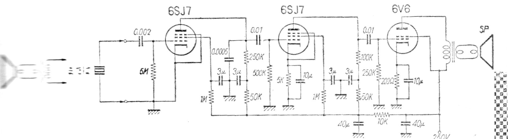 Este circuito simple de algunos watts no incluye la fuente de alimentación. Se puede utilizar con un micrófono dinámico de baja impedancia. El circuito es de una publicación japonesa de 1955.
