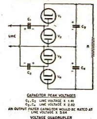 El circuito de la figura muestra cómo podemos implementar un cuadriplicador de tensión de válvulas usando 4 diodos simples. La tensión de trabajo de los capacitores debe ser el doble de la tensión de pico de la red, o al menos 300 V.