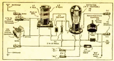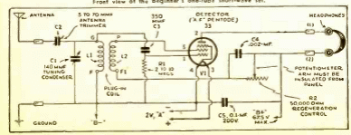 Este circuito está indicado para principiantes, escuchando con auriculares de alta impedancia. El circuito es de una publicación de 1942. No se da la fuente de alimentación y la bobina tiene detalles en el enchapado que también damos. La antena debe ser externa de acuerdo a la banda de onda recibida.