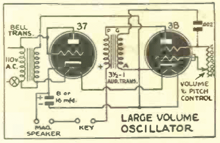 Diseñado para el entrenamiento del código Morse en grupo, este circuito de dos tubos se encontró en una publicación de 1943. El circuito está alimentado por la red eléctrica y tiene una salida de altavoz. El circuito también tiene un control de volumen.