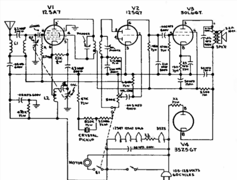 En nuestros días es la música de los MP3 y el acceso de las tabletas y teléfonos celulares a programas musicales. En aquella época eran los pequeños tocadiscos con radios embutidos para la banda de ondas medias. En la figura el diagrama de uno de estos aparatos de GE usando 4 válvulas en una amplificación de amplificación directa (no era heterodino).